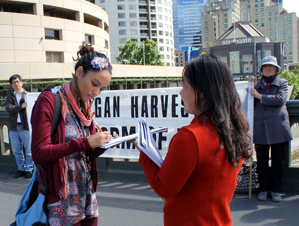 当地法轮功学员西蒙(Simon)介绍说:三十多岁的西人女士艾伦(Camilla Allen)主动过来签名,她表示,曾在中国大陆居住了一年,真难以想象这种罪行正在发生。艾伦说,一定要让所有人都知道这个事情,制止活摘器官的暴行。因为内心的震惊和难过,艾伦女士不禁泪流满面。