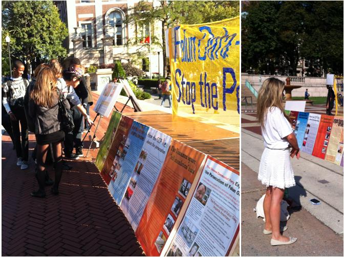 展览过程中,也有不少来自中国的学生学者驻足阅读。绝大多数中国学生学者都对法轮功学员报以微笑鼓励,还有学生在经过展板时竖起两个大拇指,给法轮功学员加油。有一位来自中国的学生在展板前看了很长时间,之后主动与展览的志愿者交流,她首先表示迫害法轮功是绝对错误的,但是还存在“法轮功参与政治”的观念,志愿者指着真相点的横幅(横幅上写着“停止对法轮功的迫害”)表示,从一九九九年迫害发生以来的十三年中,没有发生过任何一起法轮功学员的过激行为,我们没有任何政治目的,对政权不感兴趣,我们的横幅写得很清楚,“停止迫害”是我们的唯一诉求。这位中国学生表示理解,志愿者将《·九·评*共产党》介绍给她,她收下表示回去要看。