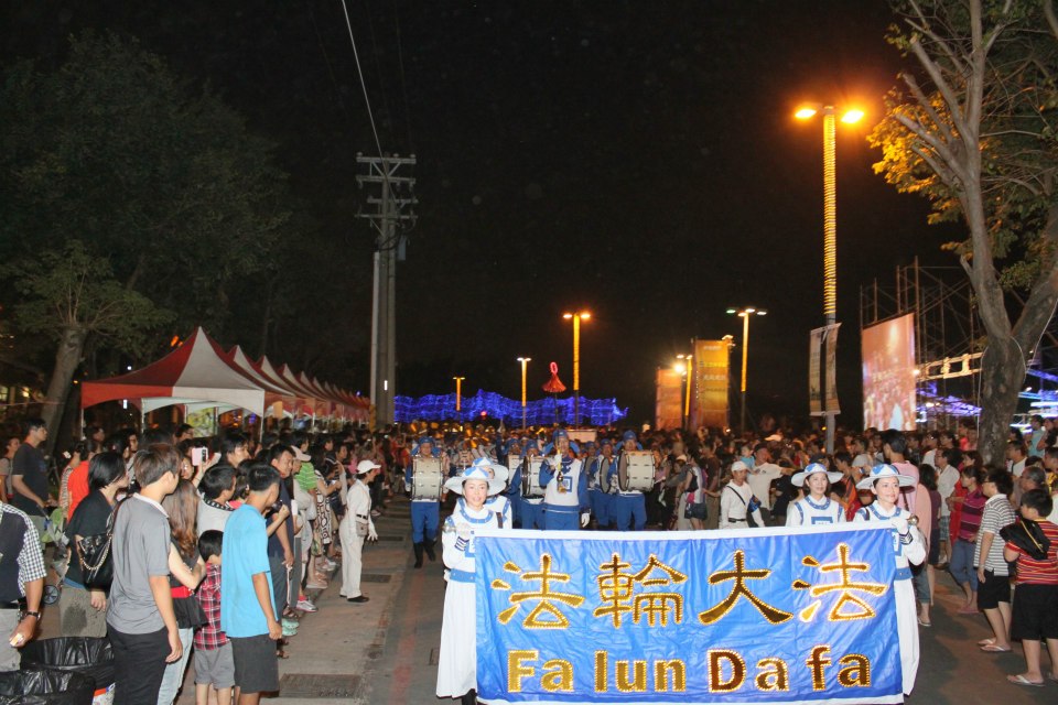 活动主持介绍说:现在邀请法轮功的天国乐团带来精彩的表演,大家请拍手鼓励。这个是世界最大的乐团,感谢法轮功天国乐团来赞助万年季,让这个活动越来越国际化,再次感谢,感谢法轮功。