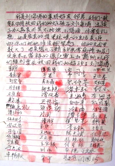 签名书说:“我们是刘海涛的亲朋好友、邻居,我们一致要求返回我们的好孩子刘海涛,这孩子为人善良、朴实、不抽烟、不喝酒、非常有礼貌,他是家里的顶梁柱,是家里唯一的经济来源,由于你们把他绑架走了,他的父母年龄大了,母亲想儿子精神失常病情加剧,使原本不富裕的家庭雪上加霜。所以我们强烈要求放回我们的好孩子刘海涛。”