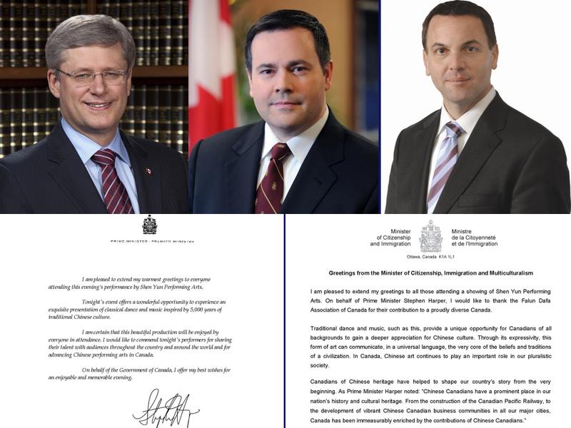![]() 神韵艺术团二零一三年度世界巡回演出前夕,加拿大总理斯蒂芬•哈珀(Stephen Harper),加拿大公民、移民暨多元文化部长杰森•康尼(Jason Kenney)以及安省反对党领袖提姆•胡达克(Tim Hudak)发贺信。 |