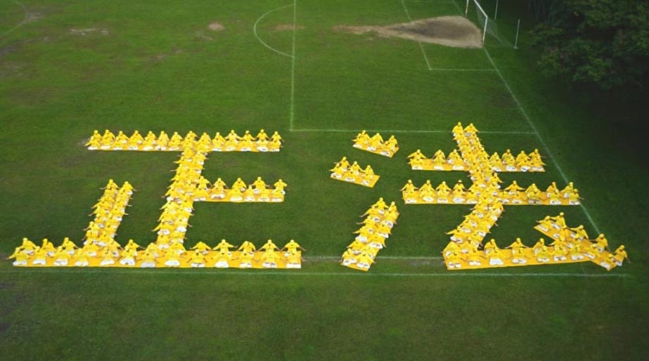 来自各地的法轮大法学员,无论是新、老学员,年长或年幼,大家齐心合力,共同将“正法”两字整齐地排出来,希望把法轮大法的美好带给当地民众。