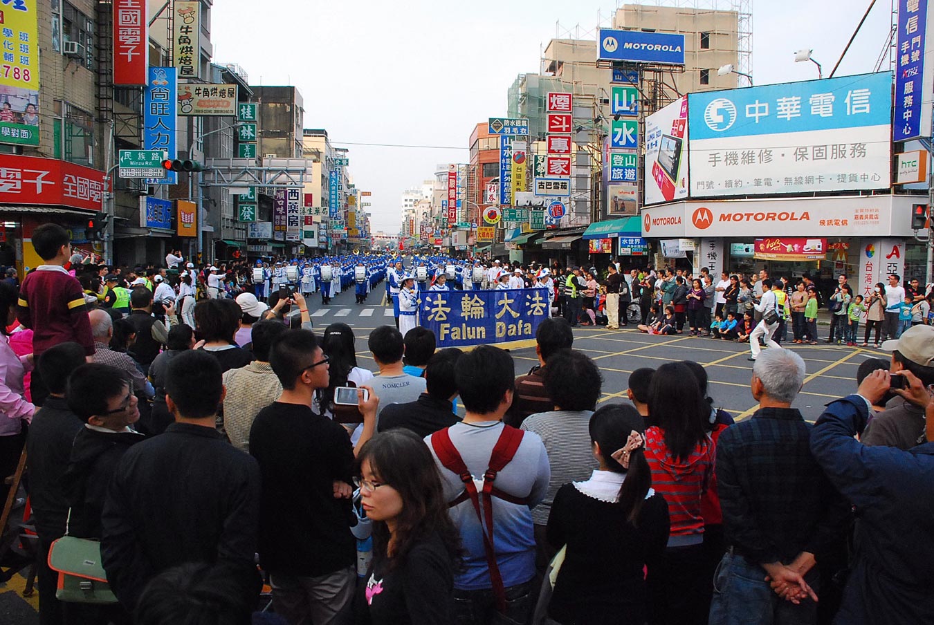 中山路是当地人文商业荟萃的中心大道,天国乐团团员身着蓝色唐装,庞大的军容震撼整个嘉义市。在中山路起点演奏第一曲“法正乾坤”时,就吸引民众眼光。街道两旁围观的群众,望着天国乐团惊呼:“这是最壮观的乐团!”