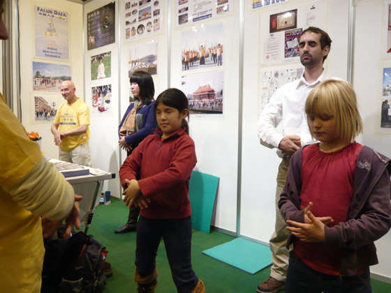 ![]() 在法轮大法展位上,不断有参观者前来学炼五套功法 |