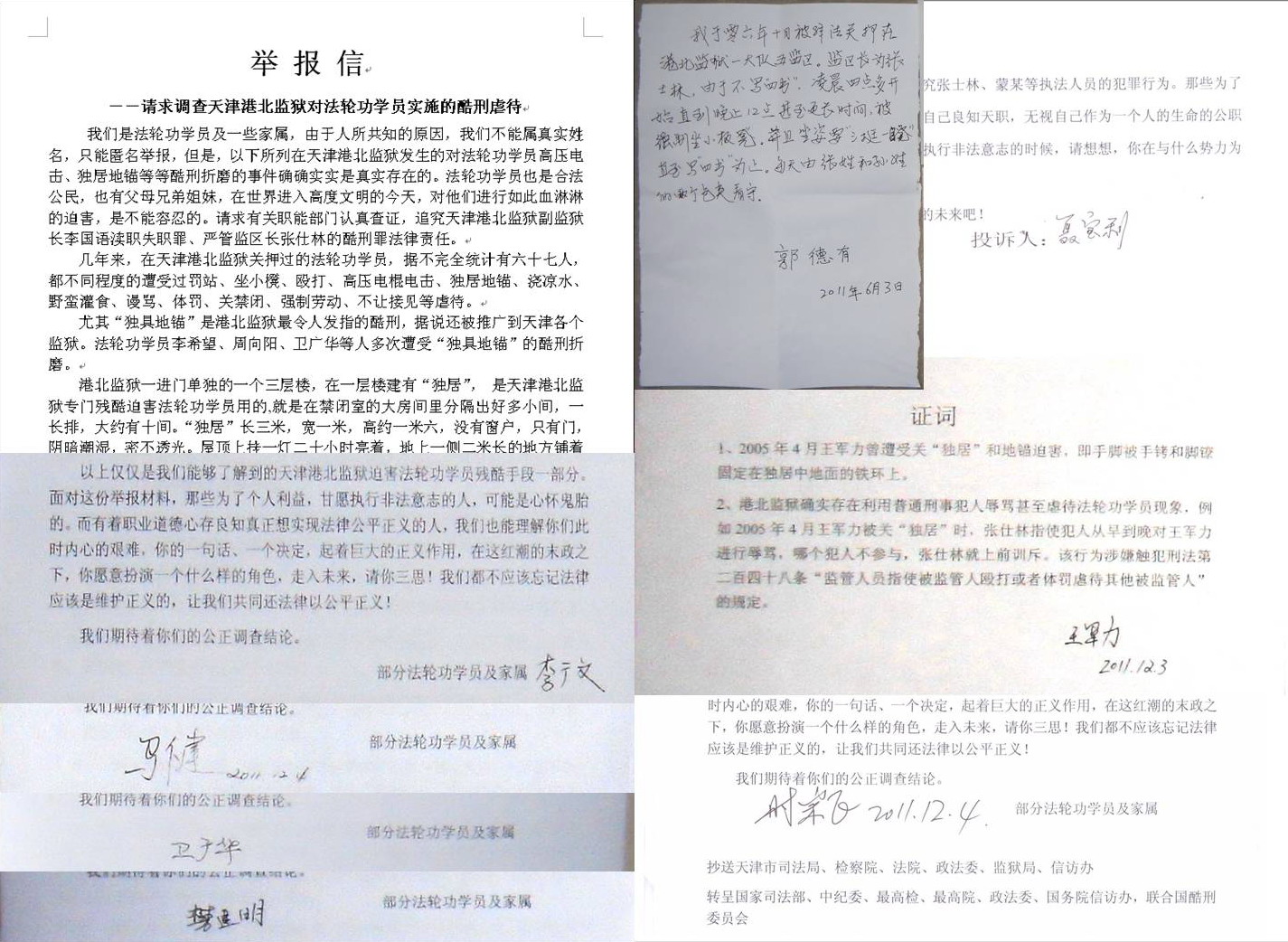 这份已被当事受害人共同签名作证的举报材料,在十二月份由周向阳的俩位北京正义律师,再次递交到天津市检察院和监狱管理局,目前仍在等待答复。