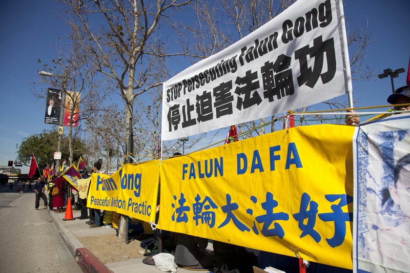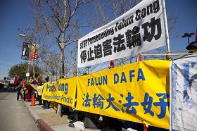【明慧网二零一二年二月十九日】二零一二年二月十六日,中共国家副主席习*近*平抵达此次访美的最后一站——洛杉矶,于十七日晚返回中国。十五、十六、十七日,法轮功学员和支持者分别在中共驻洛领事馆等处集会抗议,并打出“法轮大法好”、“停止迫害法轮功”、“法办江泽民、罗干、刘京、周永康”等横幅,责令停止迫害、法办迫害元凶。这些正义的呼声受到媒体关注和过往行人的鸣笛致敬。美国广播公司的ABC7电视台、法新社、《洛杉矶时报》、自由亚洲电台、中央社、《台湾时报》等在进行了现场采访报道。