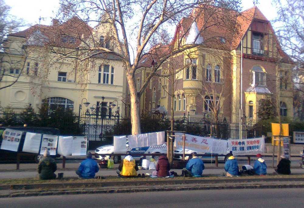 ![]() 匈牙利首都布达佩斯,法轮功学员在中使馆门前和平反迫害。 |