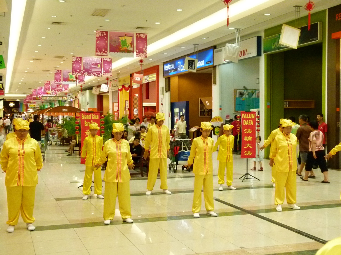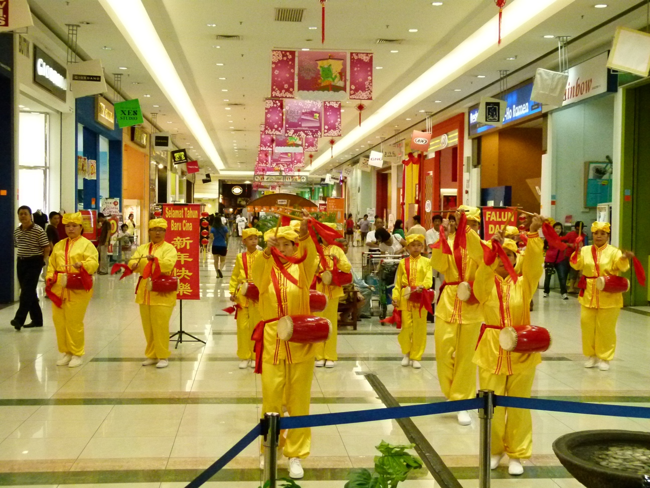 【明慧网二零一二年二月三日】二零一二年一月十五日,马来西亚柔佛州新山法轮功学员组成的腰鼓队,应邀到当地一家大型超级市场表演迎接新年的活动。在超市内,法轮功学员身穿金黄色腰鼓衣服出场时,马上引起超市内人群的关注,当动听的腰鼓声响起时,吸引了现场的人士停下了脚步围观。