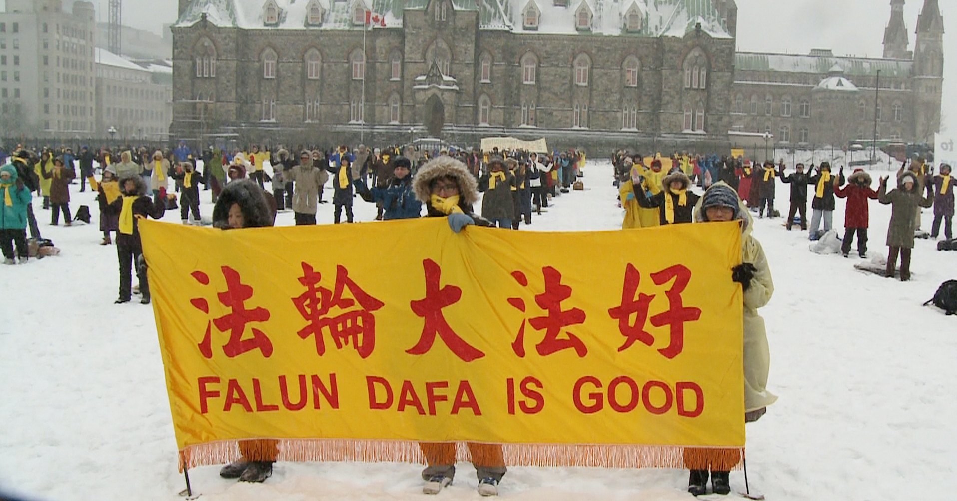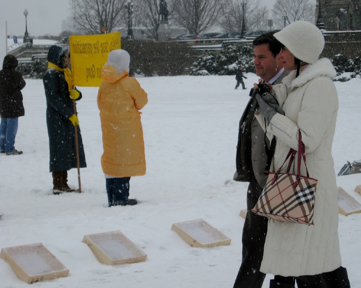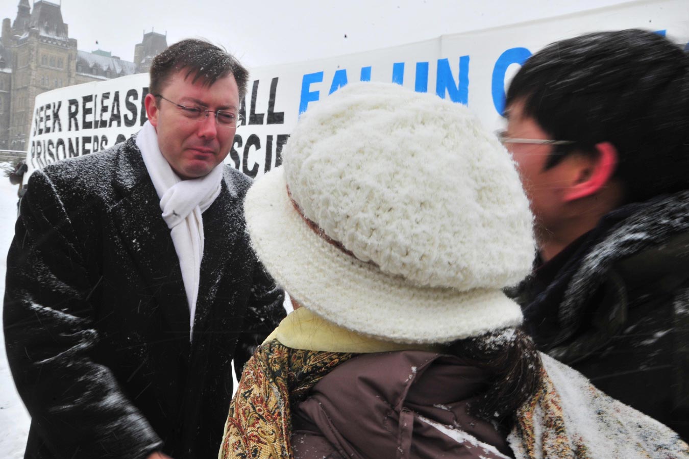 加联邦绿党领袖、国会议员伊利沙白·梅(Elizabeth May)女士为法轮功学员们在轻柔的雪花中炼功的宁静、美丽所感动:“你们就象这轻柔的雪花,对社会有百利而无一害,我会永远与你们站在一起!”