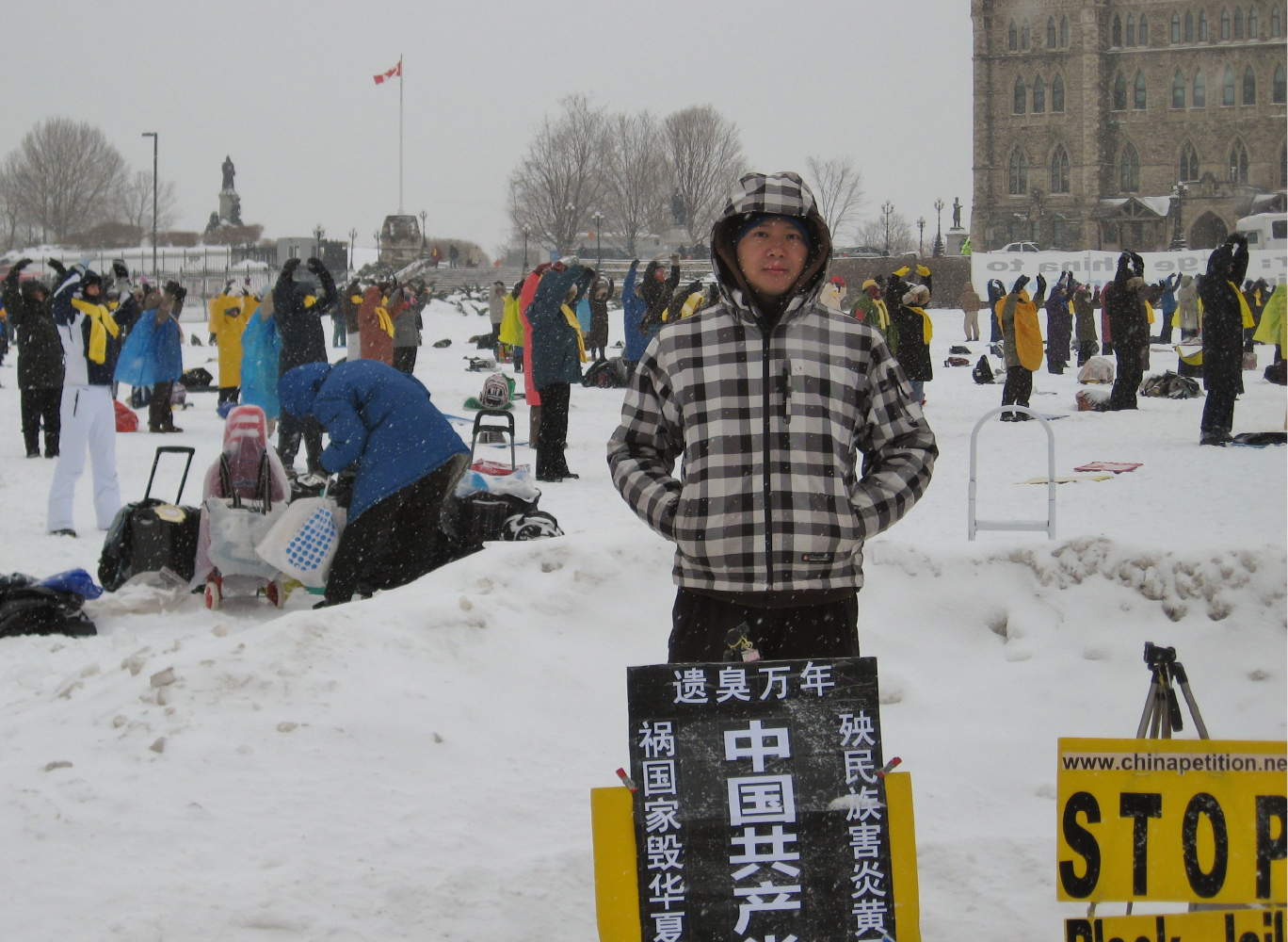六年前来加拿大留学的孙武俊,因亲人们在浙江宁波的房屋被强拆,在国内上访无门,一年半前开始在加拿大国会山抗议中共暴政,呼吁国际社会关注。今天在这里发生的一幕幕震撼着他的心,他把自己的抗议展位摆在法轮功学员的一边,表达声援。