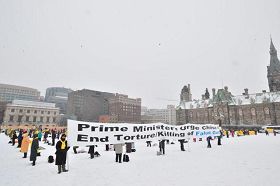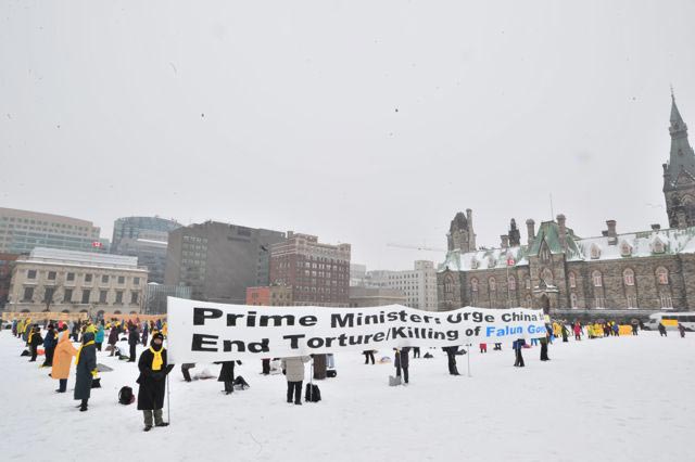 哈珀出访前夕,来自加东城市的法轮功学员在首都渥太华国会山前聚会,在暴风雪中呼吁总理在访华期间,提出法轮功受迫害问题。