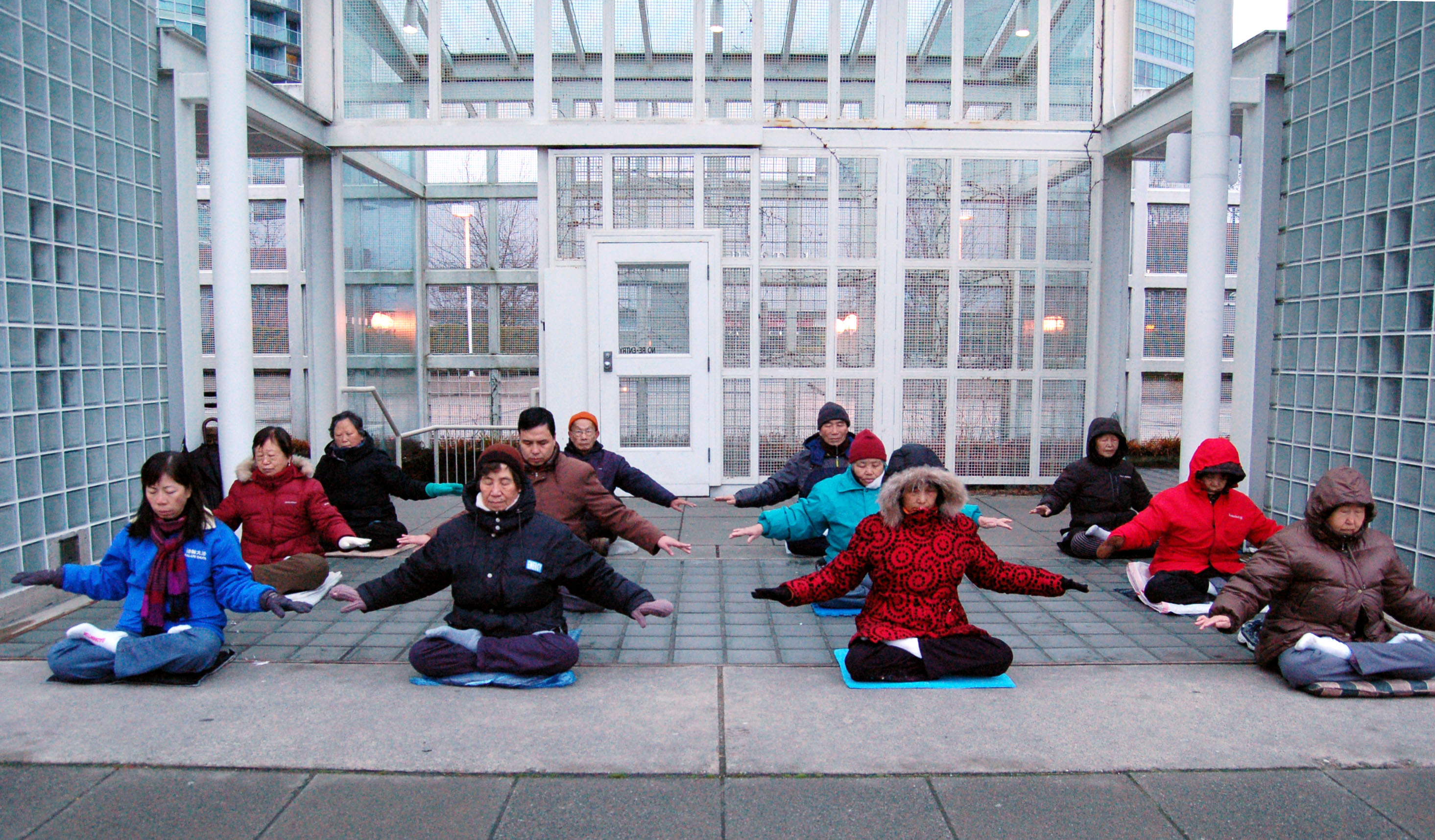 ![]() 加拿大温哥华本那比图书馆前的法轮功炼功点 |