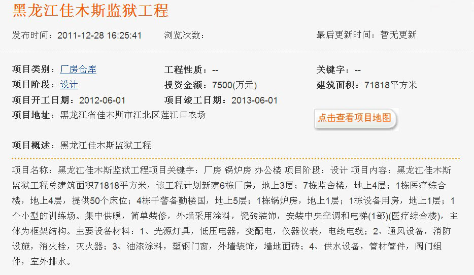 令人不解的是,在佳木斯监狱罪恶杀人的二零一一年,原本豪华奢侈的办公楼对面和现有各项设施齐全的监区内又开始大兴土木。通过一个来自互联网的截图,我们可以看到,这是一项建筑面积71818平方米,投资金额高达7500(万元)的监狱工程。