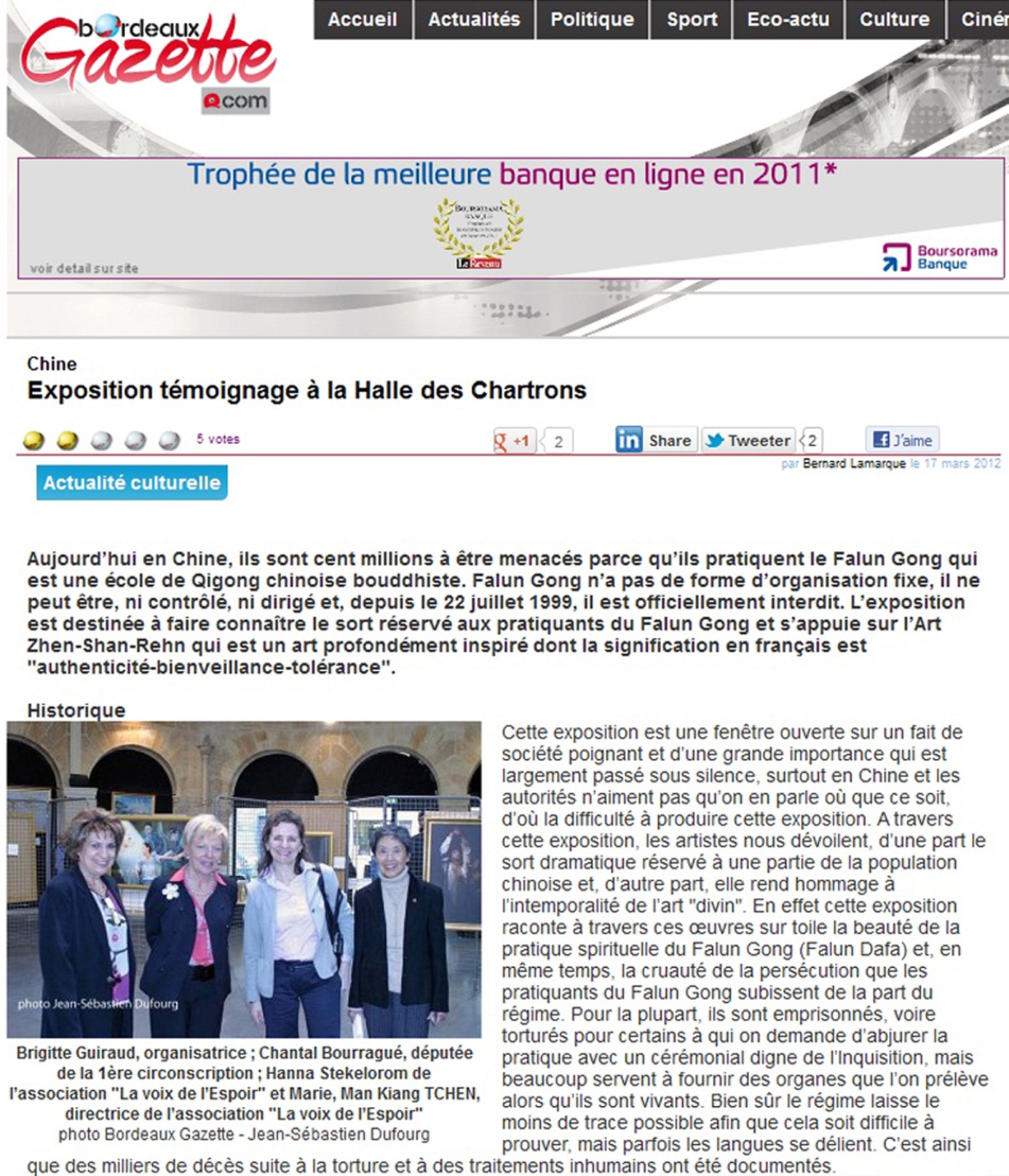 《波尔多报》记者参加了开幕式,他们在《波尔多报》上向民众详细介绍了真善忍画展。文章中写道,画展提供了一个了解中国社会尖锐问题的窗口,尤其是中国当局不愿谈论且被广泛忽视的问题。艺术家们通过这个画展向我们揭开一部份中国人(编者注:法轮功学员)的悲惨命运,一方面对神的讴歌是永恒的艺术。画展的作品展现了修炼法轮功的美好,及法轮功学员正遭受中共当局的残酷迫害,他们大多数被非法关押、酷刑折磨、被强迫放弃信仰和专横的调查。也有一些被活体摘取器官贩卖……因此成千上万的酷刑和不人道待遇造成了死亡记录。