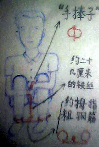 第二天一早,牢内的人们刚开始干活,他们又拿来那个东西叫我签,还说要连签一星期。我一看,上面原来空白处写上了“利用邪教组织破坏法律实施罪”,这是他们强加的罪名,我不承认。拿过笔来把昨晚的签名、手印全部勾掉。为此,他们把我带出牢房,戴上一种刑具(如下图):一根铁棍两头支出两个可打开的铁环,卡在脚脖子上,铁棍中间有个环儿,两手腕重叠,用“手捧子”卡住,“手捧子”下有个眼儿,和下边脚镣的环用一段约二十厘米的铁丝绑上。(他们叫“戴镣”)。戴上后,只能双手抱在膝盖、小腿前蹲着,无法直立。我高喊:“法轮大法好!”一恶警(后经人指认叫徐会来)抄起半截拖布把狠打臀部十几下,钻心的疼痛,我本能的躲闪,戴那个东西又迈不开步,我倒在了地上,前额蹭破了一块皮。臀部青紫很长时间。