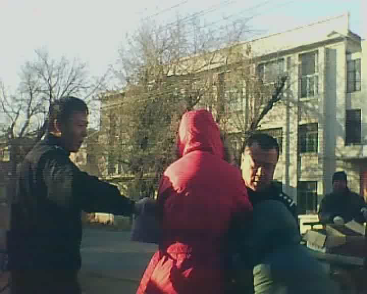 在李文胜的命令下,几个人上来拽的拽,抻的抻,连拉带扯,我使足力气,抓住门框与楼梯扶手以抗争不被他们绑架。这时李文胜又叫上几个女协警,把我的胳膊、腿同时拽住,把我连拖带捞,半拖半抬,不知过了多长时间,到了他们事先准备好的车门口。因为车门的限制,他们拽着我的胳膊往车上拖我,我用脚顶住车门坚决不上车。这时男警刘金山用脚狠劲的踹我,我说:“你打人!”他说:“我打你了!”我告诉他:“打人是要负责任的。”这次他加重了语气说:“对,我打你了!” “我就打你了!”