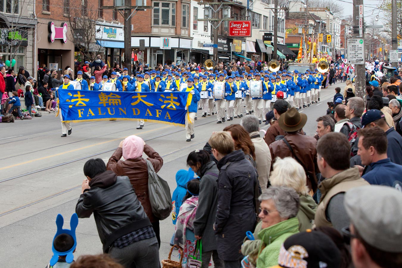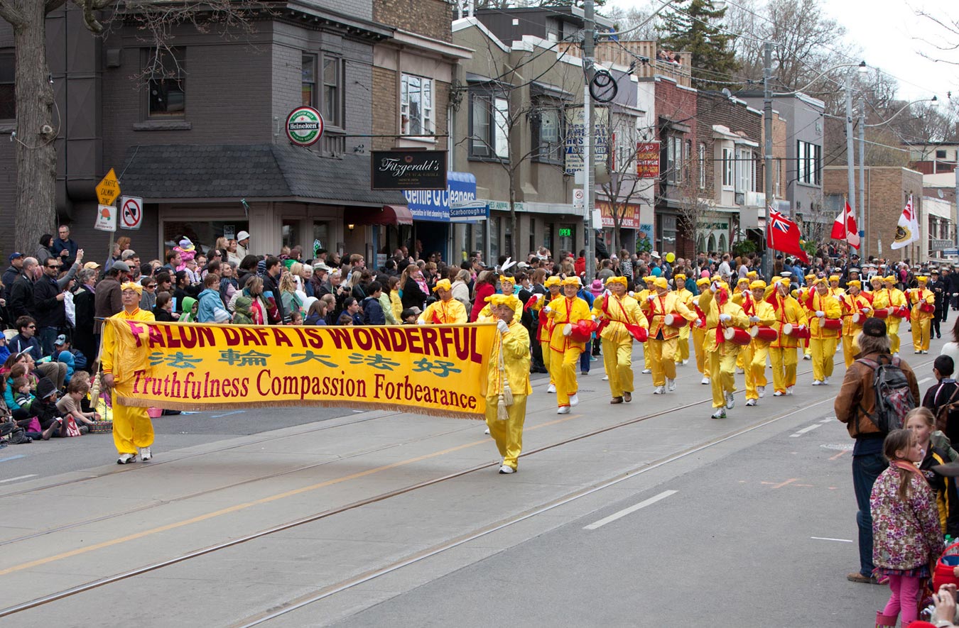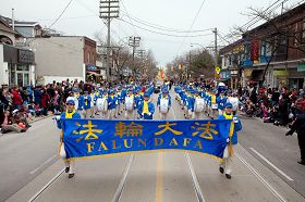 由八十多名法轮功学员组成的天国乐团以其明亮的服装、雄壮的音乐成为游行队伍中一道亮丽的风景线。天国乐团负责人江帆介绍:“自二零零八年开始,我们是第五年受主办方邀请参与复活节游行。”