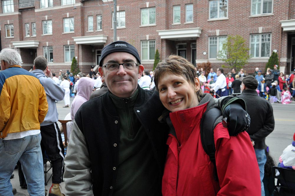 多伦多市民苏特诺(Ross Saturnl)和太太林女士一起观看游行。苏特诺赞游行很棒,“我喜欢腰鼓,很动听。”