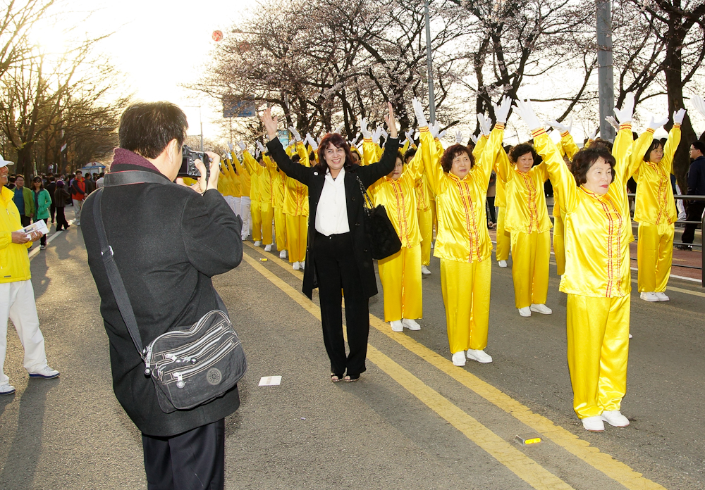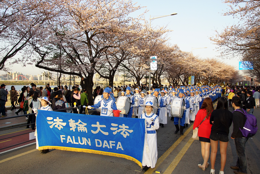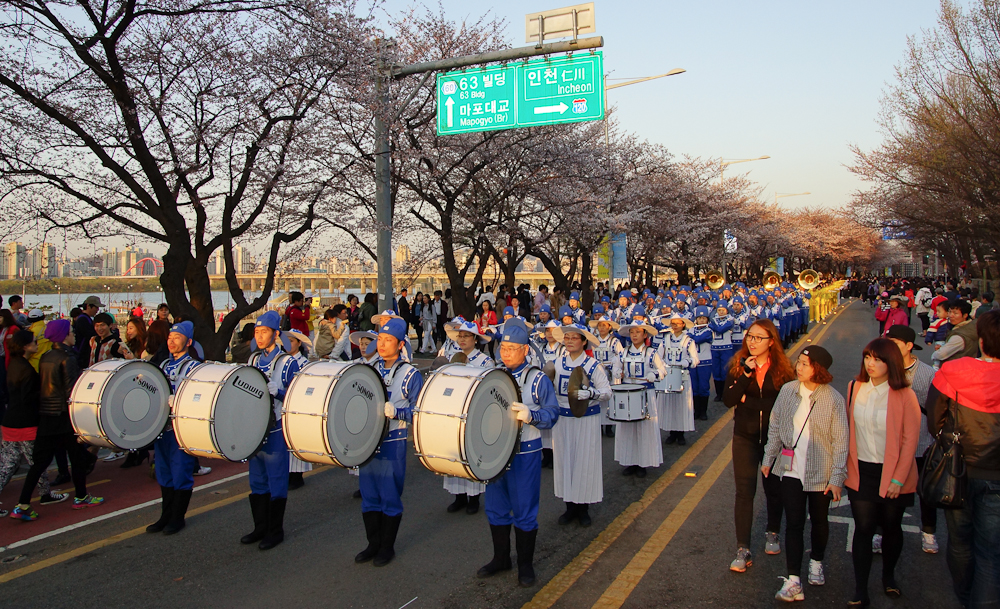 天国乐团所经之处,游客们都按动相机快门,忙着拍照留念。由于是首尔最大的春花庆典,中国人、东南亚人、西方人等外国游客特别多。其中有的中国人看到法轮功的游行队伍惊讶不已,有的中国人还主动接过真相传单,表示要回家仔细看看。
