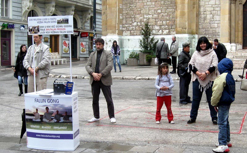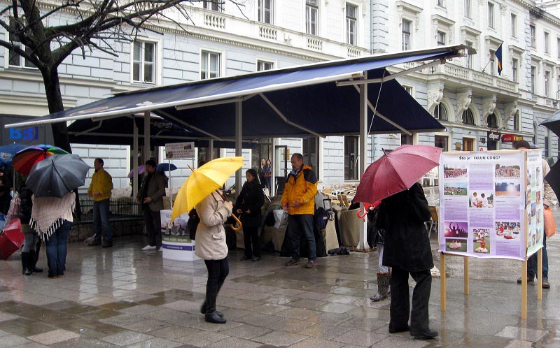 一个小时后,雨停了,信息台移到本市著名的Jesus's Heart Cathedral东正教教堂前的Fra Grga Martic广场上,这里人潮涌动。从教堂里出出进进的人停在信息台前,伸手接学员递过去的真相资料;有人主动和学员交谈,打听什么是法轮大法;有人看学员演示功法,表示要学炼,问在哪里学,找谁联系。