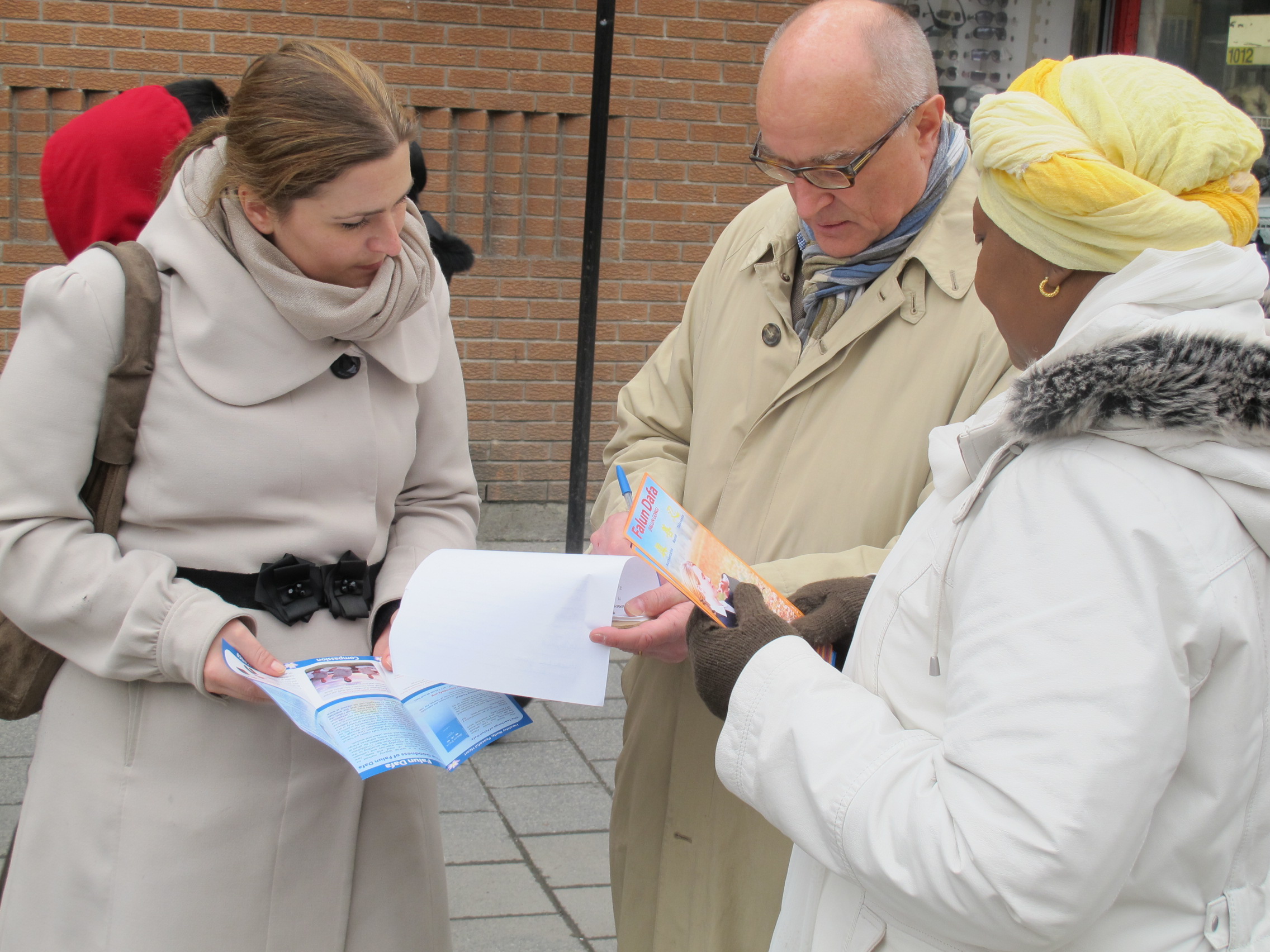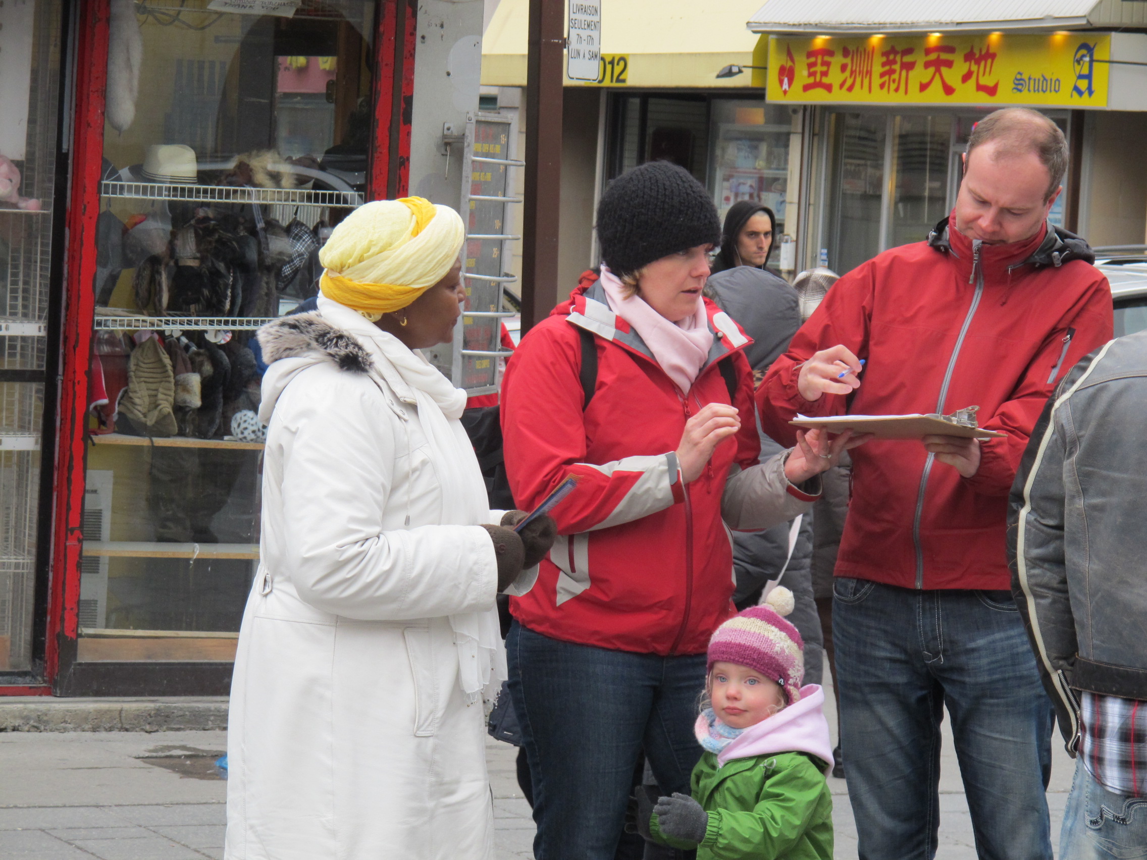 六年前移民加拿大的刘先生和陈先生在真相展板前看了很久,最后表示退出曾经入过的中共邪*党-组织。