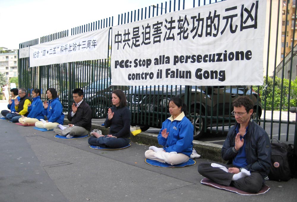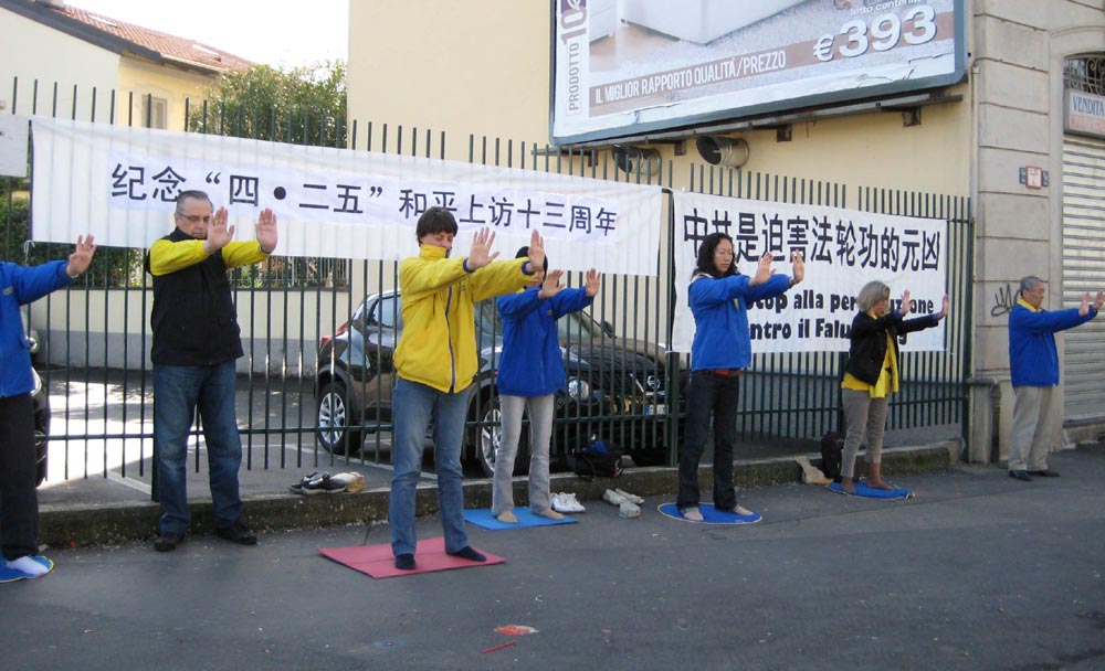 上午九点,法轮功学员在米兰中领馆前静坐和炼功,向外界展示法轮功学员反迫害的坚定意志:十三年来,在中共江氏集团的残酷迫害和极端抹黑下,法轮功蒙受千古奇冤,承受无名苦难。但法轮功学员仍然坚持以和平理性反迫害持续不断向全世界民众讲真相反迫害,希望人们不受中共谎言蒙蔽,明白真相,选择善良。