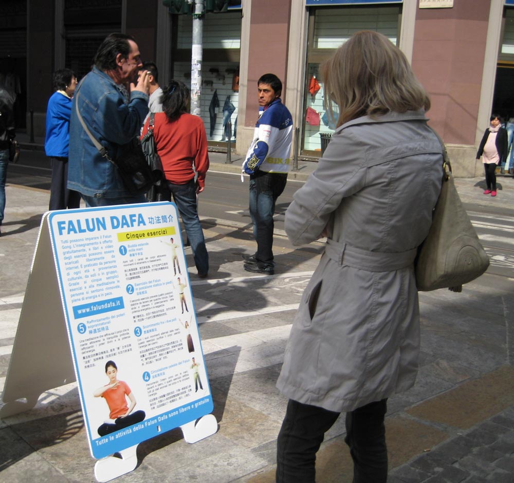 ![]() 意大利民众阅读展板,了解法轮功 |
