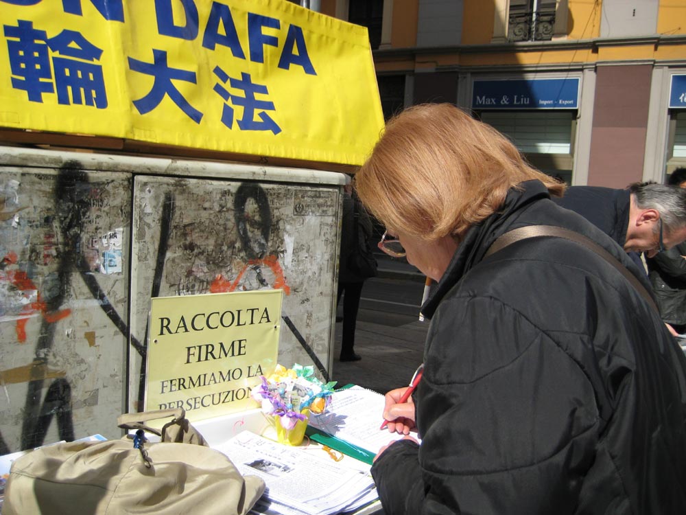 中共迫害法轮功的残酷让善良的民众感到不可思议。一些人主动上前在征签本上签名,呼吁制止迫害法轮功。有的在了解真相后与学员握手,表示支持和祝福法轮功。一位意大利人说,请再给我一份中文的资料吧,我有朋友是中国人,我可以带给他看,让他了解这场迫害!