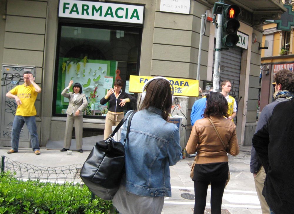 法轮功学员在华人街上一炼功,立刻吸引了人们关注的目光。有的当场向学员询问法轮功是什么,哪里可以学功。一位意大利女孩觉得法轮功炼功动作很美,非常喜欢,在询问了一些法轮功真相后,当场就跟着动作比划起来。最后她做了一个法轮功“两侧抱轮”的动作,手上举着真相传单,让她的朋友给她拍照留念。