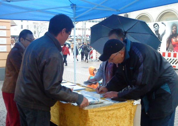 在海德堡市中心的步行街上,法轮功学员向来往的行人介绍着当年“四•二五”事件的来龙去脉,以及法轮功学员在中国遭受到的残酷迫害的真相。许多人在了解真相后,在制止迫害的征签簿上郑重地写下自己的名字。