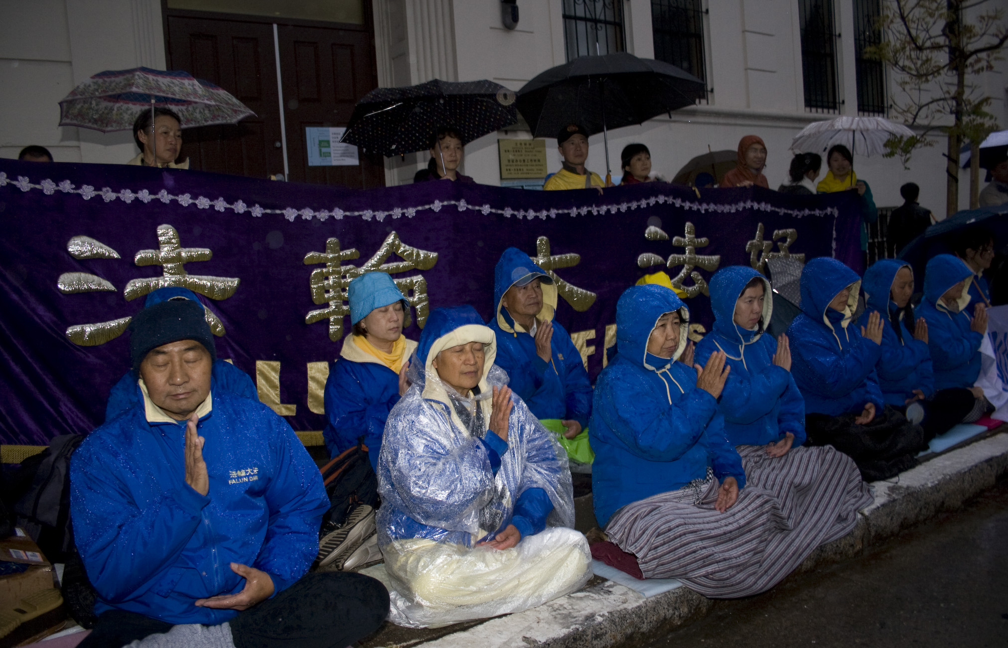 当晚,旧金山下起了大雨,但法轮功学员依然冒雨在中领馆前静坐,要求中共停止迫害法轮功。他们手持“法轮大法好”、“停止迫害法轮功”、“法办江泽民、罗干、周永康、刘京”的中英文横幅。
