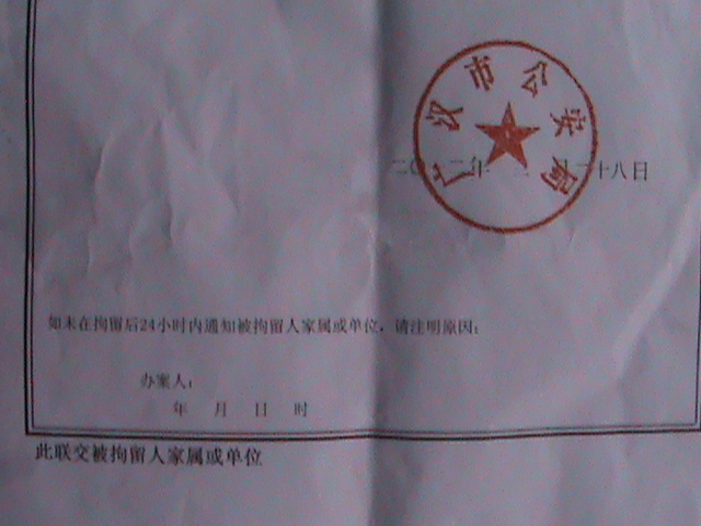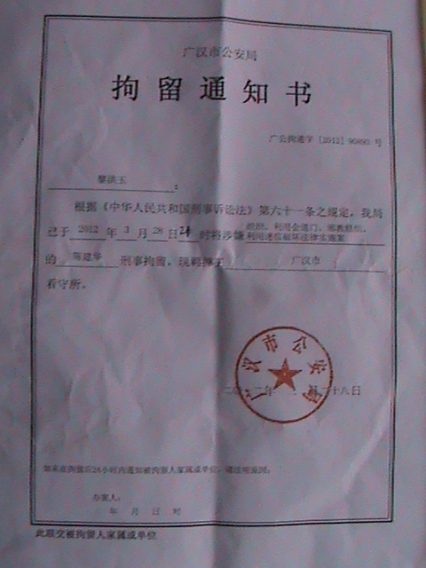 陈建华家属收到的《拘留通知书》属执法犯法情形:罪名来自刑法三百条,但刑法三百条只字未提法轮功,不敢留办案人签名,没有年月日时(后附《拘留通知书》照片)。