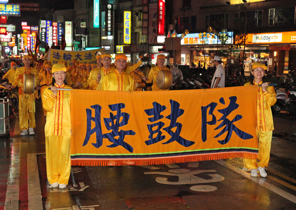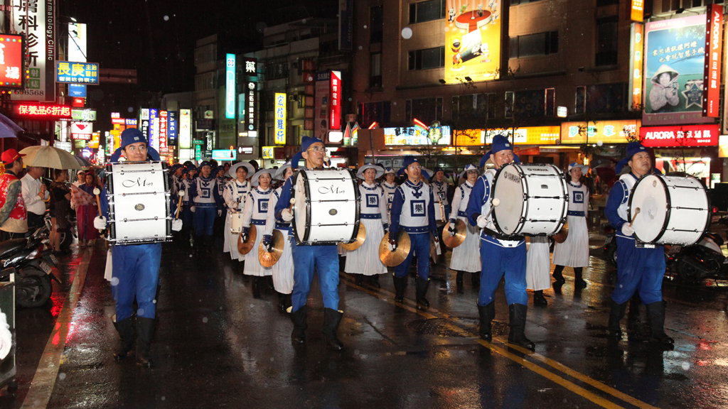 游行队伍由前导的龙队和天国乐团引领。当晚天候不佳,阵雨连绵,参加的队伍都穿着雨衣演出。而民众见到天国乐团的团员们丝毫不畏风雨,仍雄壮威武,大家都竖起大拇指说:“赞!加油!”而带给民众愉悦的唐装仙女们,以及腰鼓队振奋人心的鼓声,也吸引群众拿着手机、照相机不断拍摄。