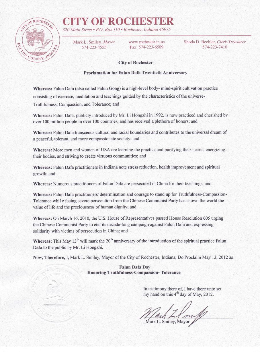 鉴此,我,印第安纳州罗切斯特市市长马可艾欧思麦力,特此宣告二零一二年五月十三日为印第安纳州罗切斯特市法轮大法日, 颂扬真、善、忍。