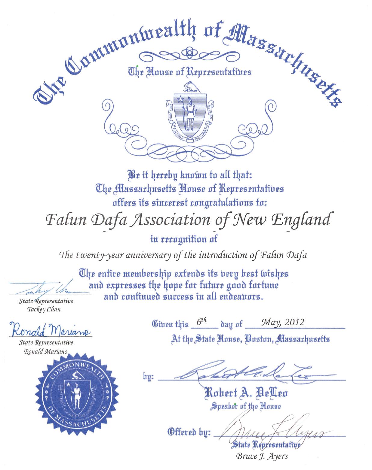 二零一二年五月六日于麻萨诸塞州众议院,波士顿市罗伯特·迪理欧(Robert A. DeLeo)州众议院发言人 (签字)