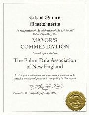 褒奖第十三届世界法轮大法庆典日,市长特此嘉奖新英格兰法轮大法学会我祝愿你们继续在本地区传播和平信息而不断取得成功。