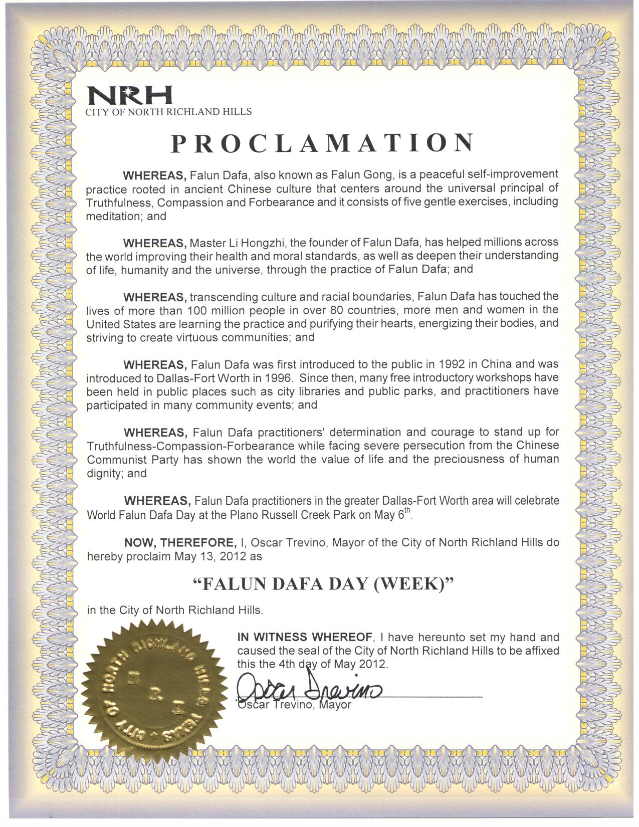 鉴于,达拉斯-福特沃斯地区法轮大法学员将在五月六日在布兰诺Russell Creek公园庆祝世界法轮大法日。