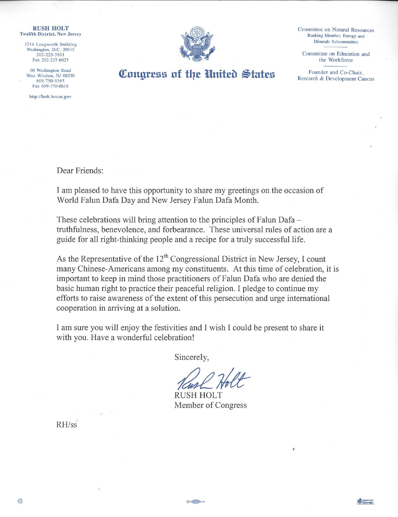 在新泽西的第十二国会选区,有许多华裔居民是我的选民。在这一庆祝的时刻,重要的是铭记那些被剥夺了行使和平宗教信仰这一基本人权的法轮大法修炼者。我誓言将会继续努力,来唤起对这场迫害程度的关注,并敦促国际社会在达成解决上的合作。