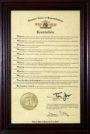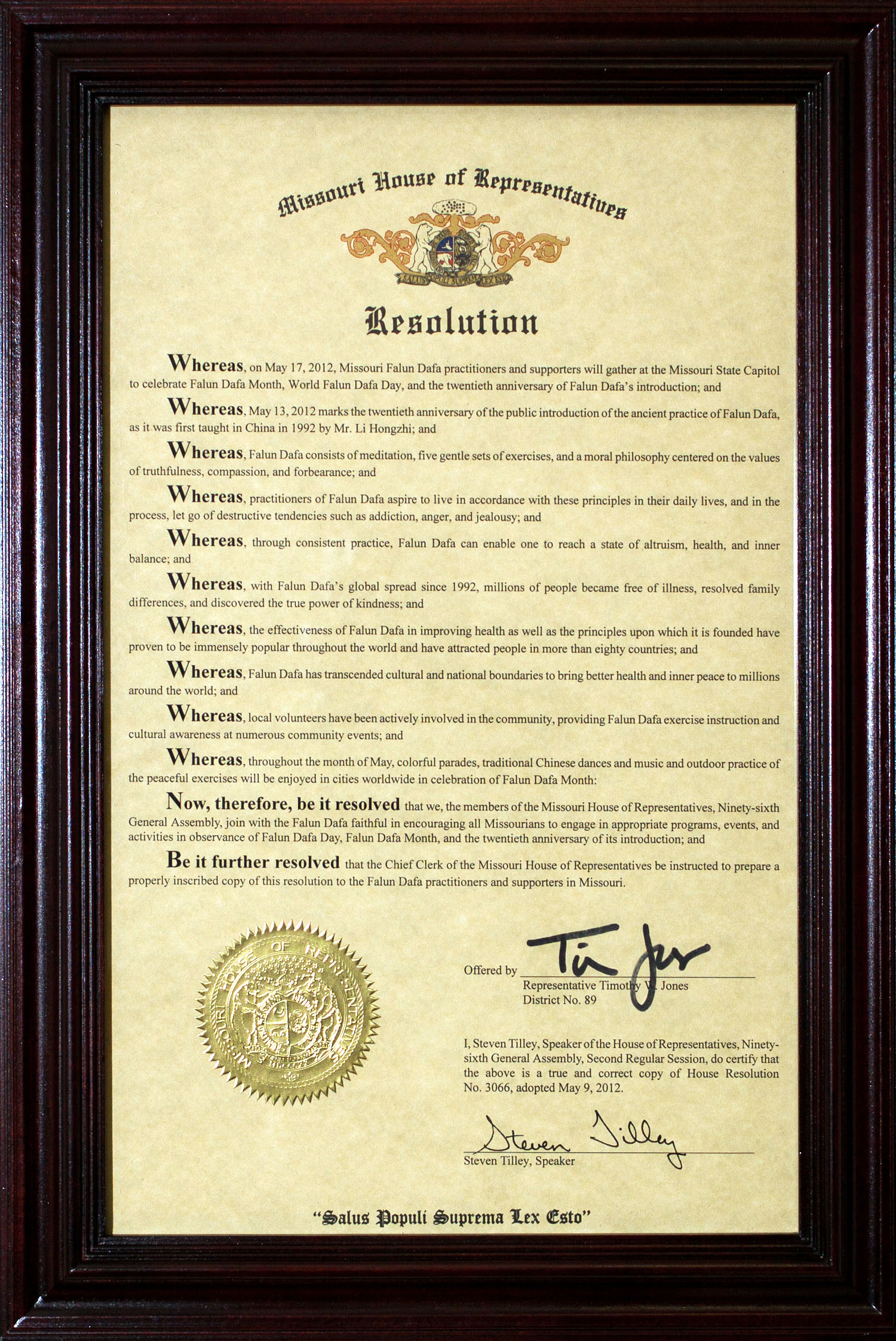 这项决议由密苏里州众议院文书负责提供副本给法轮大法学员及其支持者。