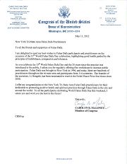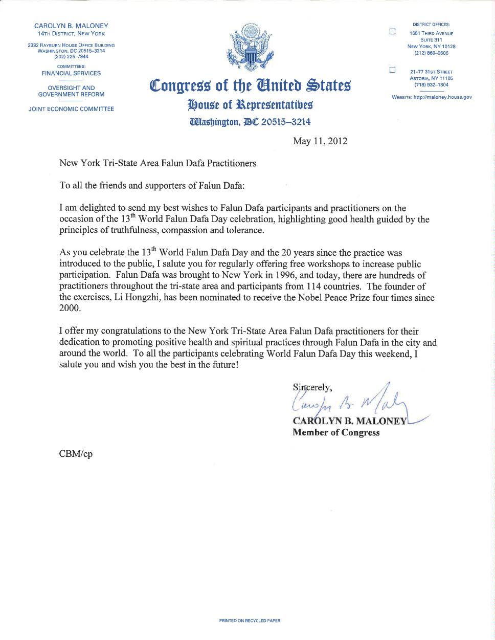 在你们庆祝第十三届世界法轮大法日和大法洪传二十周年之际,我向你们致敬,你们一直为社区提供免费的介绍班,鼓励公众的参与。法轮大法于一九九六年来到纽约,现 在在大纽约地区有成百上千的人修炼,并在一百一十四个国家有修炼者。法轮功的创始人,李洪志先生,二零零零年起曾被四次提名诺贝尔和平奖。