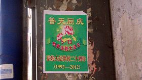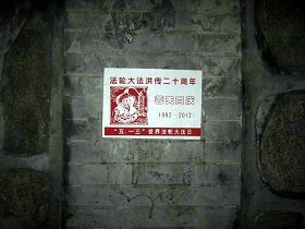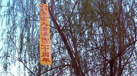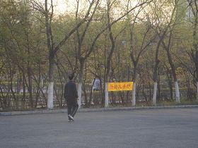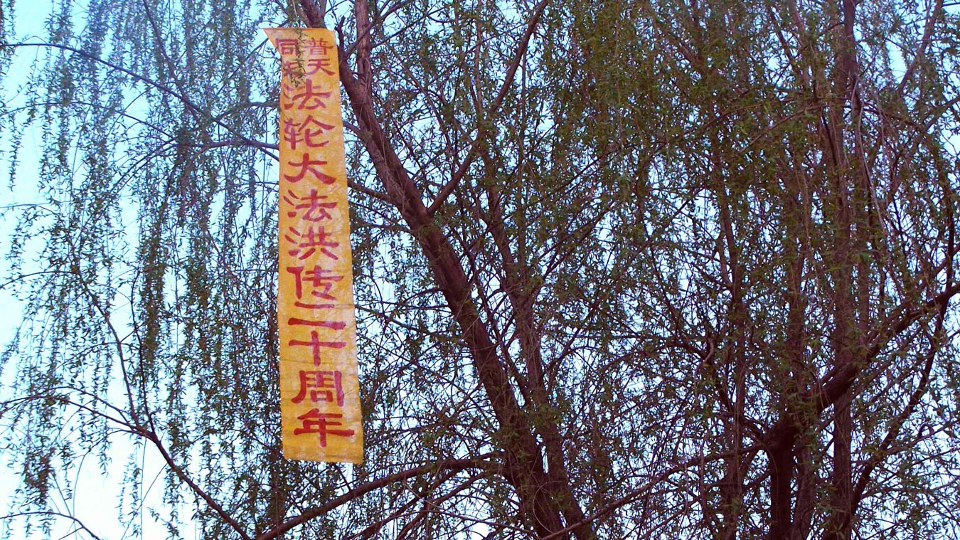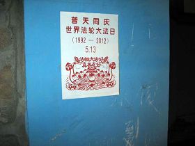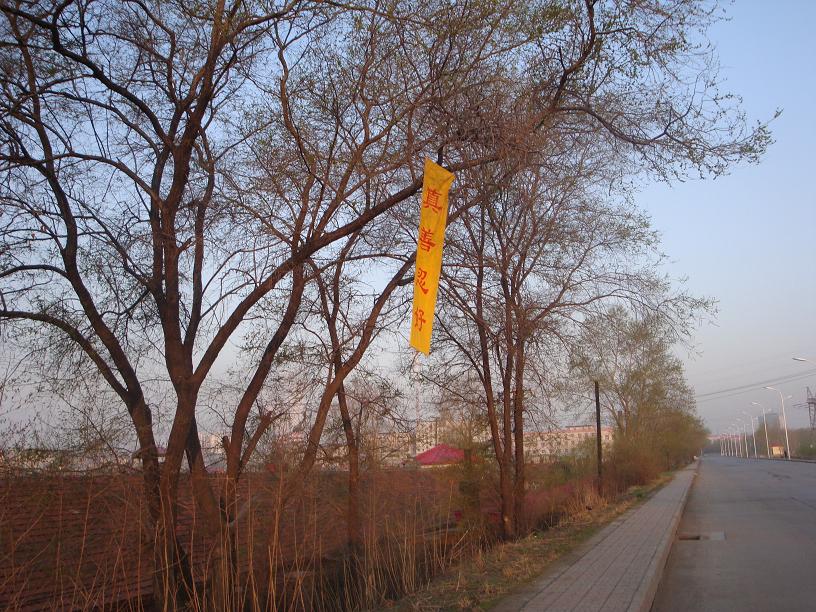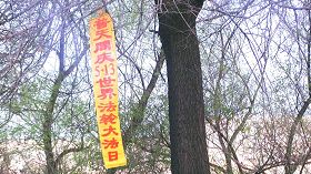 五月十三日是世界法轮大法日,今年的五月十三日标志着法轮大法洪传于世二十周年,大陆大法弟子以各种方式纪念这个神圣而庄严的日子,东北某市公园、路边和住宅小区内出现大量的真相条幅和不干胶贴。引来众多民众驻足观看,多数人一边绘声绘色的念着条幅上的每一个字,一边发出不同以往的感叹,“法轮功了不起!”特别是对于“法办江罗刘周”的条幅,更是倍感兴致。有的还故意询问“这几个人是谁呀”,有的在回答问题。真的会感到环境在变,世人在觉醒。