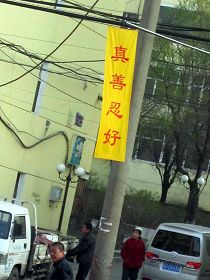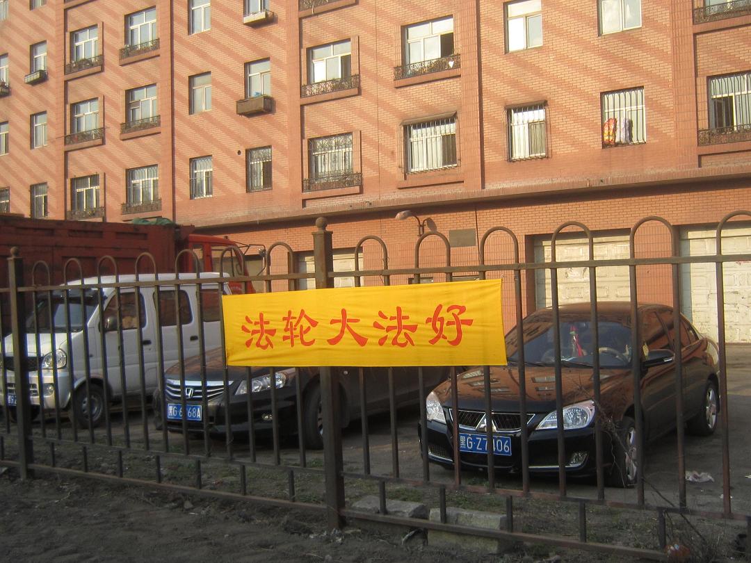 黑龙江省鸡西市大法弟子在各处街道、居民区悬挂“法轮大法好”“真善忍好”条幅,庆祝大法洪传二十周年。