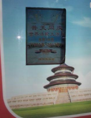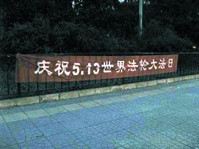 中央党校附近,悬挂着“庆祝5.13世界法轮大法日”横幅;颐和园附近的路边和树上挂着“5月13日 庆祝法轮大法洪传世界二十周年”、“法轮大法好”、“世界需要真善忍”等内容的条幅;北京大学周围的电杆、围墙、广告栏上,张贴着真相不干胶。