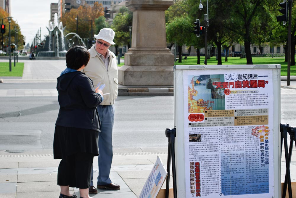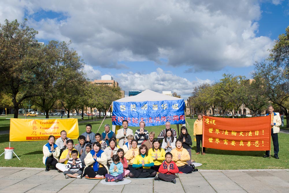 二零一二年五月十二日,南澳法轮功学员聚集在阿德雷德维多利亚广场,恭祝师尊华诞,庆祝即将来临的“五一三”世界法轮大法日及大法洪传二十周年。学员们以集体炼功、摆展板、分发真相资料的形式向人们讲述法轮功的真相。