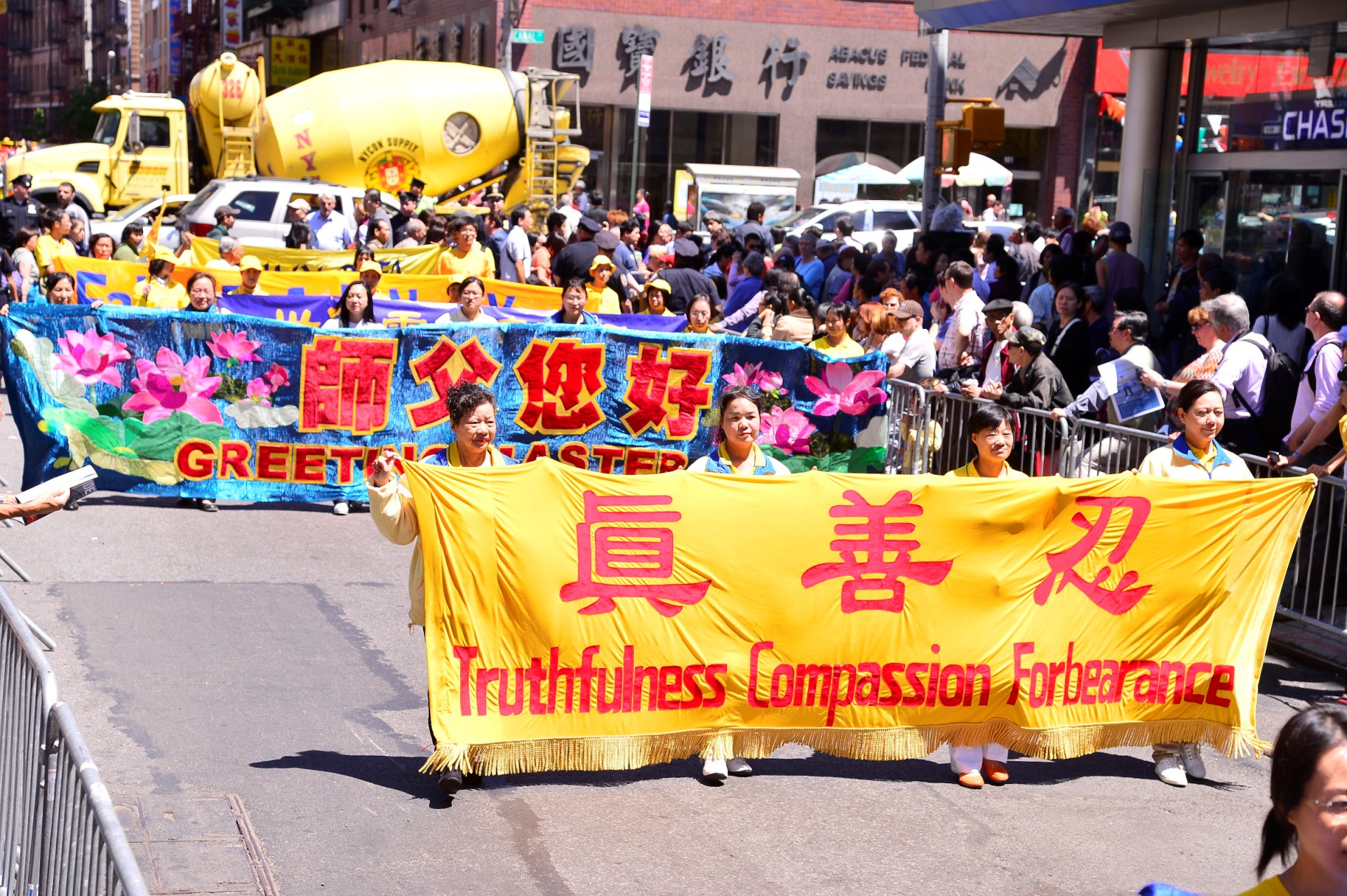 正在全神贯注观看法轮功游行的中年华人黄先生,望着一波一波的横幅从眼前过去,法轮功游行的气势深深吸引他。他说:“法轮功讲‘真善忍’,法轮功学员是一群好人,却受到迫害,诬陷,被认为有什么‘自焚’。这一点影响着很多中国人对法轮功有负面看法。”黄先生在纽约是以导游为职业的,他介绍说“我经常接待从中国大陆来的游客,这些游客代表着中国大陆很多人的看法,他们对中共所说的深信不疑,还很难去了解真相是什么,‘认为中共就是中国’。我认为:一旦中共解体,被迷惑的中国人将会后悔。中共的解体很快、没有多远了。”