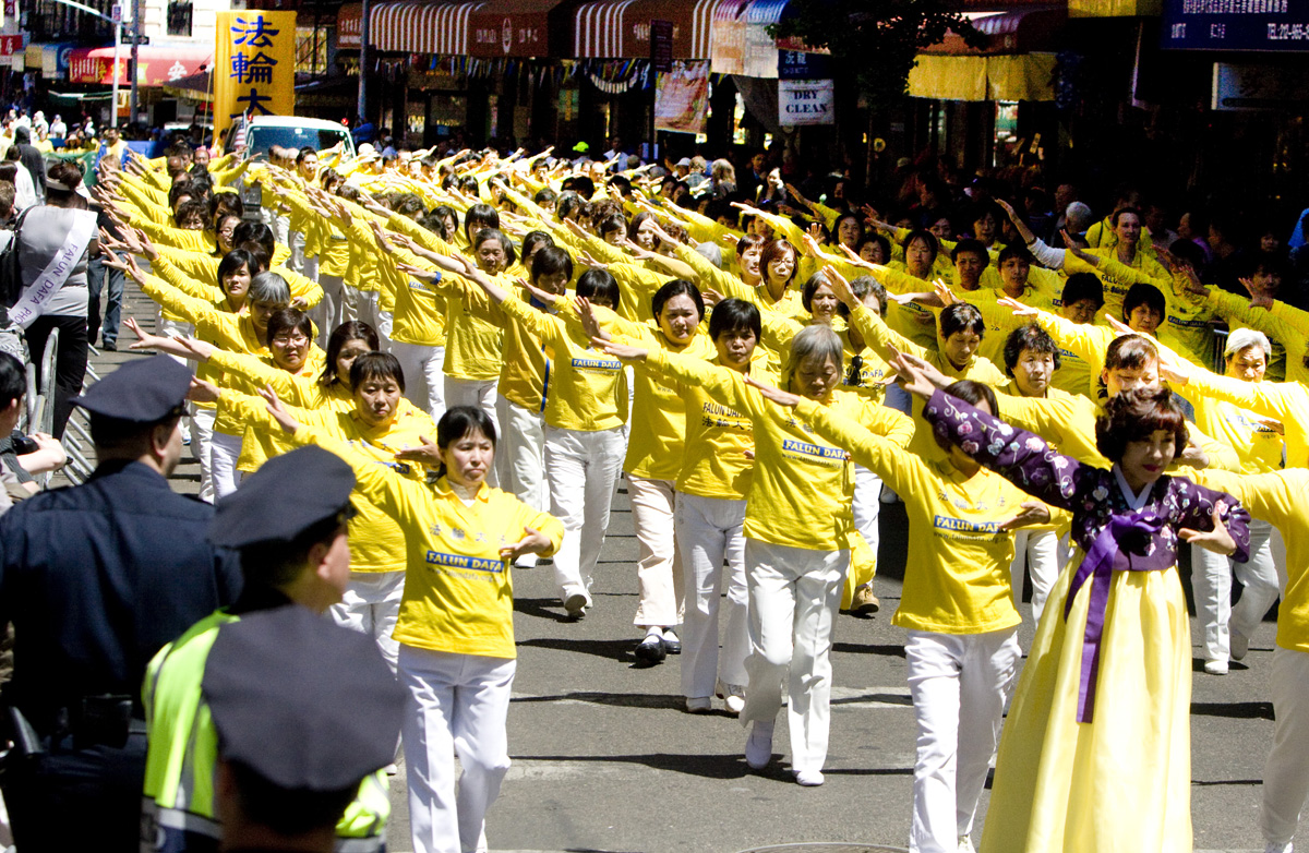 盛大游行队伍由三百多名法轮功学员组成的天国乐团开道,雄壮的《法轮大法好》、《法鼓法号震十方》、《法正乾坤》、《送宝》和《法轮圣王》等曲目震撼人心。巨大的法轮功书籍的模型在阳光下熠熠发光,身着仙女装的仙女队飘然而至,犹如步入仙境,舞狮舞龙队喜庆吉祥。由台湾法轮功学员组成的庞大的炼功方阵,向人们演示着法轮功的功法,整齐祥和,宁静超然。