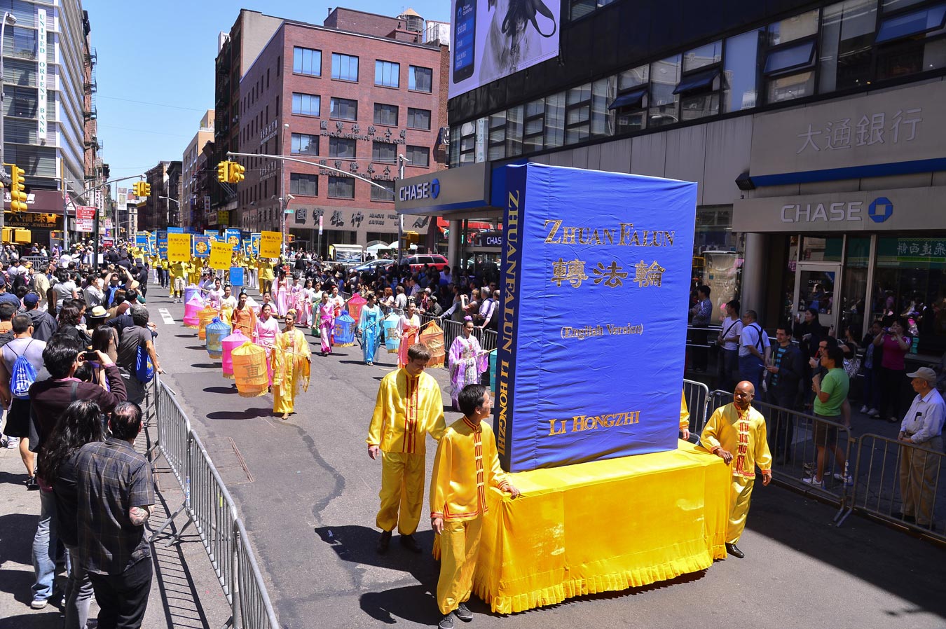 当天的天气,和风日丽,阳光灿烂,声势浩大得前看不到头、后看不到游行队伍的尾,吸引了不少民众观看。过往路人不时地停下脚步,沿途商家纷纷走出店门一睹法轮功的风采。