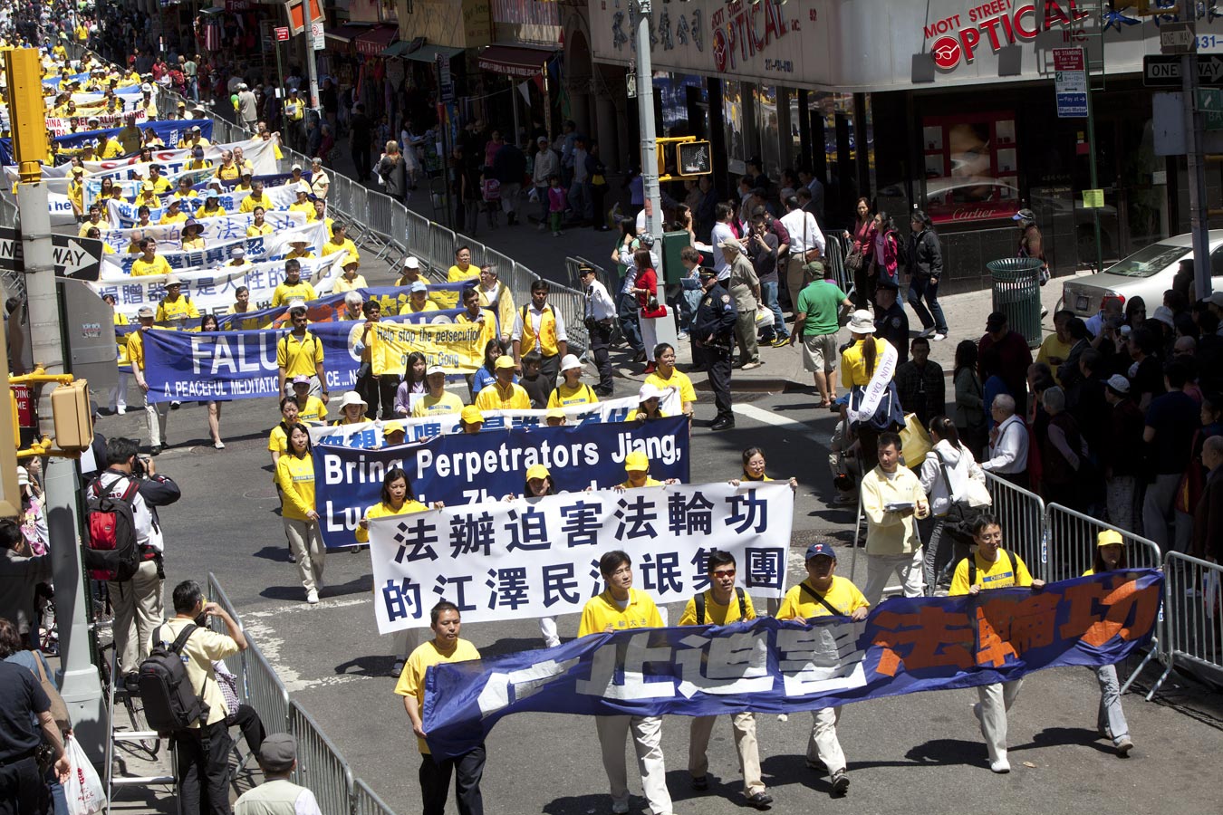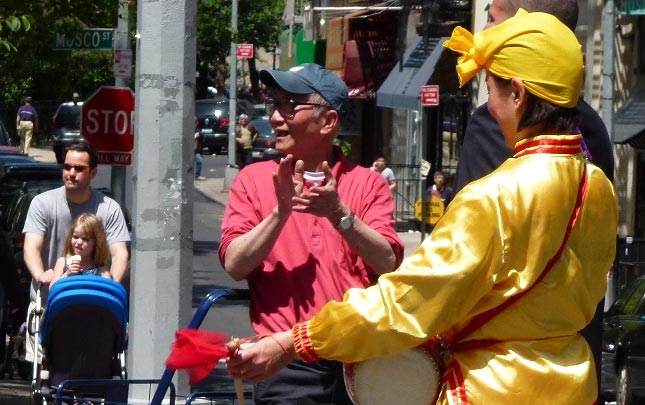 游行队伍最后是腰鼓队压阵,一位老先生高兴地一会儿对着游行队伍竖起大拇指,一会儿鼓掌。这位先生姓赵,他说:“对于信仰来说,你可以信,也可以不信,但你(中共)不能打压。每个人其实都有信仰,你可以信法轮功,或者信佛。即使你什么也不信,那也是个‘信仰’。你可以说我错了,但你也不一定对啊。人是应该互相尊重的,不能使用暴力。
