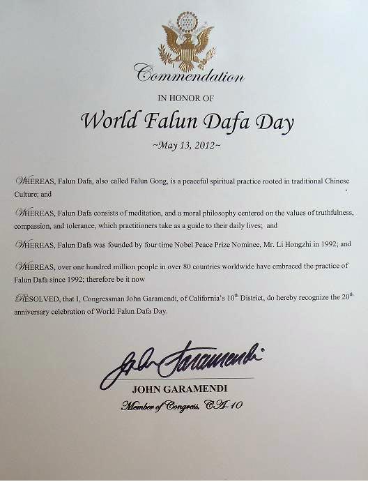 因此,我,美国国会众议员约翰•葛拉曼迪加,来自利福尼亚州第十选区,特此祝贺第十三届“世界法轮大法日”。