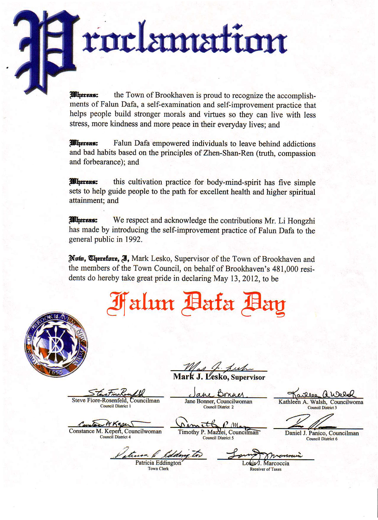鉴于,布鲁克海文镇荣幸的表彰法轮大法的成就。法轮大法是一种检查自我和改善自我的功法,帮助人们加强品行道德的修为,使人们在日常生活中少些压力,多些和善、亲切与祥和;